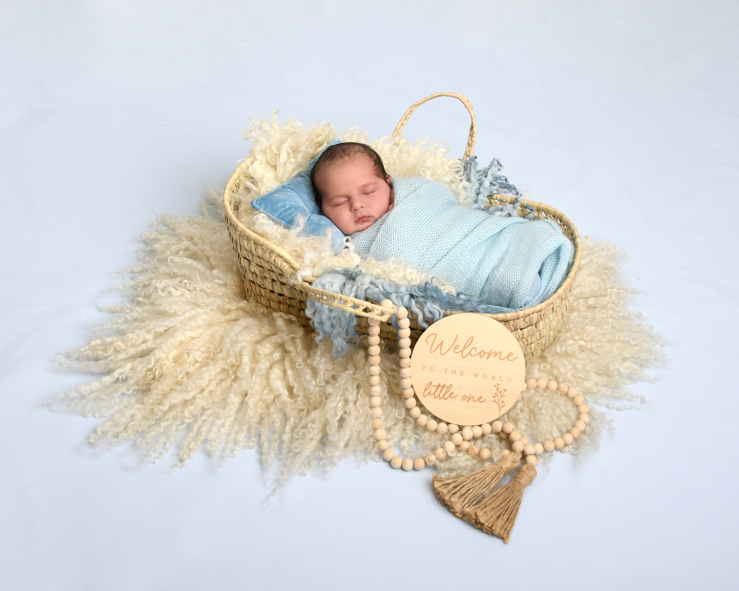 - Baby wrapped and photographed in the mini moses basket
